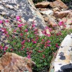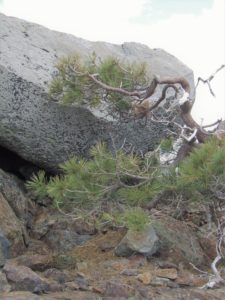 We stopped for a snack on a solid granite ledge, about twenty feet above Island Lake, with a view of several…wait, wait , wait for it…islands, many inlets, and the ever glistening, infinite tones of blue. The trail was muddy in spots, with small rivulets of water streaming down the trail from the final vestiges of snow patches surviving for a few more days in the deep shadows. There were some wildflowers, great boulders, and rich riparian zones around the lakes and alongside the connecting streams that “chain” them together. But my eye was usually stretching outward, searching the ridges that divided the lake basins, searching for the next lake, trying to define islands from granite ledges stretching out into the depths; up to the precariously perched lookout on top of Grouse Ridge; up to the flag on top of Fall Creek Mountain – a sort of center piece of one of the loops of lakes that form a liquid apron around its base.