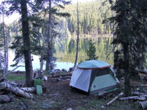 We switch-backed our way on down the mountainside until we finally came to the lake at the bottom – not the bottom of the lake. Not a soul was in sight and it was very peaceful and still. There was no campground (thank god) but we came upon a nice camp spot alongside the lake shortly after the road leveled out. There was another large open site about 200 yards further down the road, pretty much at the end of the road, but to get there you had to go up another very steep stretch of loose rocky road. All in all, we liked the first spot better, so we backed in and scouted about. In the fifty feet or so from parked truck down to water’s edge, you dropped maybe 20 feet in elevation, but there were three plateaus in the site – one good spot for the tent about half way down to the water, a second level spot that had a fire ring, and then another large fire ring at water’s edge. After a celebratory beverage, we unloaded the truck and kind of had things distributed to the appropriate levels and somewhat organized.