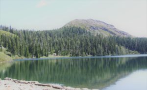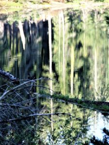 over the metal bridge to terra firma, I began to get a funny feeling; something was happening. Were some of my other lives seeping into my present? Had I been here before? Was this my house; was this my wife; how did I get here? I started to think we were back at Lindsey Lake – but how could that be? As we got to the road and walked up to the campground sign, sure enough, we were back to the first place we had driven. We had just come in a big loop and ended up camped on the other side of Lindsey Lake. Oh well, that is what exploring is all about. After a good laugh, and now having some bearings on where we were and how we got here, we headed back to our spot. After crossing the dam, we followed a little path along the water’s edge through the trees and riparian vegetation; enjoying the sparkle of the water from the sun’s rays.