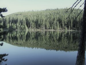 I had no intention of staying at the campground as I try to avoid people at all costs, but I did want to check it out. Ideally, we would find a spot above the lake with a view, but that was not a choice in this area. We turned around and headed back the two miles to the “Y”, and this time took the other fork, heading two miles East to Carr and Feeley Lakes. These two lakes are literally a stone’s throw from each other so they are often listed on maps and such together. We drove to the end of this road which was a trailhead parking area, but we did not see a sign or any indication we were at the lakes, near the lakes, or where they was in relation to where we was. I was cornfused.