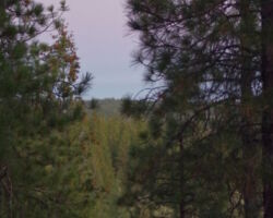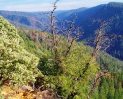 We were close to the kind of spot we wanted but this was not it.  Off we went along the ridge top road, passing an enormous blackened area that was formerly a brush pile that had been torched.  On up the road, a few potential spots were examined and passed up for one reason or another.  Soon our road was about to turn into a motorcycle track, so we stopped, examined our surroundings, our options and another beverage.  Back we went, past more power lines, poles, burn areas, flagging, paint, markings of all sorts, and motorcycle and ATV paths.  Soon, we pulled into a fairly flat, open, Pine needle covered area right on the edge of the canyon.  The trees had been cleared so we could see fairly well over the Manzanita.  We couldn’t see right over the edge to the river below us, but we got an excellent view up canyons, five, six, maybe eight ridges penetrating from North and South into the drainage each one bringing along with it a creek or tributary to feed the American River.