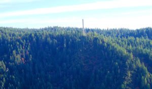 Across the canyon, almost on the ridge top, was an enormous tower, long, thin, straight up, towering above the forest and the canyon far below.  What on earth was this?  Had we found Flesh Gordon’s space ship?  This thing was a tad unsettling.