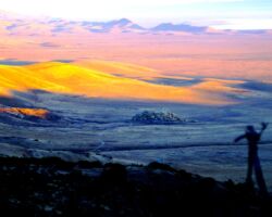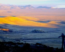 To our surprise, from up high came a light. Up and down, out of site and then within, the light became two and the orange trim lights of a vehicle became visible; a massive cloud of dust rising behind. Upon arriving at this location, I had just stopped the truck in the middle of this intersection and didn’t even think about other cars, but thank god, the roads didn’t intersect in right angles, but kinda merged in an equilateral triangle, and he came across the hypotenuse of the intersection, while we were stopped on one of the sides. Faster than his headlit approach, his tail lights disappeared almost instantly. Our frozen amazement turned to hysterical laughter. A shot of Bushmills was offered to the gods for preventing a collision of the only two vehicles for 700 square miles, and the fandango blazed on.