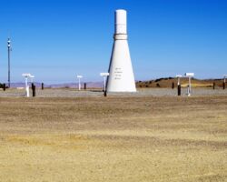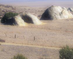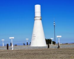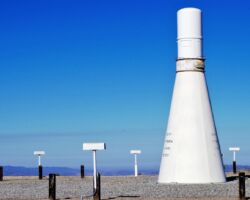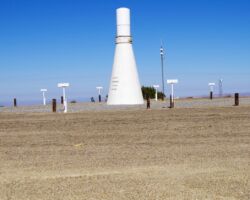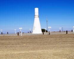 We squeezed between the shiny white 2×6 rails and walked up the driveway. The small house-sized concrete bunker hummed with AC units sticking out on all sides cooling what we assumed was massive amounts of electronics inside. Further up the road and around the bend, was a perfectly flat former hilltop, now a massive spectacularly clean gravel pad. But this was no plain, ordinary flat gravel pad that formerly was a natural hilltop; this one had a spaceship in the middle, not just the middle, in the exact center. The craft was perhaps 6 feet in diameter at the base up to about 8 feet up then tapering off to 4 feet in diameter to the top. It was maybe 25 feet tall. Around it in perfect symmetry, were maybe 20 mail box looking things surrounding the spaceship about 30 feet from the base. The boxes were about 4 feet in the air on stout posts – maybe railroad tracks like the historical markers in the Black Rock Desert and High Rock Canyon. Everything was painted white. The scene was quite striking.