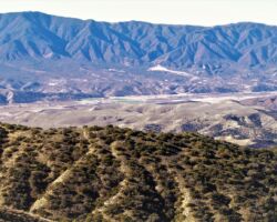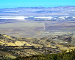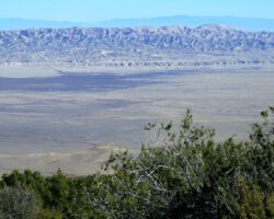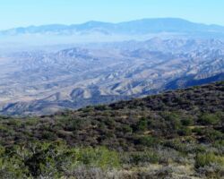 Parked at the gate, we loaded up our packs with lunch snacks and beverages. There is a trail along the hillside below us, but we decided to take the high road, as it were, and walk along the wide open ridge top. The path was perfect; wide, open, a smooth gentle rise, easy walking. We stopped often to take in the views, put the binoculars on birds, or to just soak it all in. We hunkered down in the shade about 30 feet below the road on the North slope and had a tremendous lunch with a great view out over the plains below and the Temblor Range further off in the distance. It was January 17 and we needed to find shade for lunch – unbelievable. We were just starting to think about turning around and heading back. The top of the peak was still far off in the distance so reaching it was definitely out of the realm, but the air was clear to the East and some super trippy landscapes and formations were coming into focus. We needed to continue on a bit further up the road to get a better view of this area.