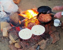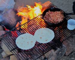 I know I have said this before, but the beauty of containerizing much of your gear is it makes loading and unloading very quick and easy. We were done in a half hour or so; an excellent spot near a massive Juniper was selected for the kitchen, the views were outstanding; a little breeze was up, but almost nonexistent on the leeward side of the Junipers. Tables, chairs, stove, were out; some gear and tents set up; tunes, beverages, and snacks; thenfire.