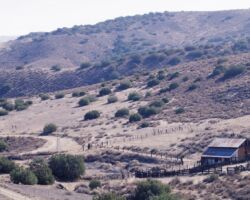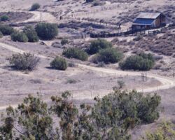 We exited Interstate 5 onto Highway 41, then 33, and then 46, passing near the site of the fatal James Dean car crash just a few miles West of where 41 and 46 merge at Shandon. Further South we followed Bitterroot Valley Road for several miles of classic “old California” landscape – golden hills, rolling on and on, scattered clumps of Cottonwoods revealing a shallow water table; the occasional stock pond turning golden brown to cash green. A cockeyed barn, a rock wall, a wooden post, some rusty wire; just a few lasting reminders of the toil and labor of homesteaders scraping a living from this tough land.