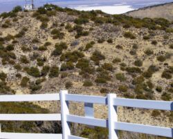 We followed the good dirt road down the South slope for a bit, just to see, and it kind of looked like more of the same – very dry, large shrubbery scattered here and there, small brush and tall grass – pretty classic southern California/Mediterranean landscape. So, it was time to go back and really investigate that structure we passed. The road leading up to it was gated and a warning sign posted about not interfering or damaging the structures. Not really a heavy/serious “KEEP OUT” or NO TRESPASSING”, “VIOLATORS WILL BE SHOT” kind of a warning; more of a, we know since you are way the hell out here that you are going to check this weirdness out, so just don’t be stupid and don’t wreck/vandalize anything. Besides, the entire area was surrounded by a really nice three rail PVC fence, like you’d see around a nice house in a nice suburb; not exactly the kind of fortress that Bond, James Bond, (Roger Moore and Sean Connery – the real James Bonds’ –not these phony Jimmy come lately’s) had to penetrate.