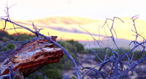 Our thirst momentarily quenched, we remounted the steed, climbing past a few more sharp curves to another wide spot and a fire ring. The BLM encourages dispersed campers to camp in existing/previously used sites. These sites are pretty obvious due to the lack of or semi-trampled vegetation, the rocks for a fire ring or perhaps blackened remains from campfires. Often flattened tent or sleeping sites have been cleared and/or scraped so it doesn’t take a paleontologist to see that other folks have camped in these spots. This spot did not have the totally unobscured 200 degree view of the prior spot, but it did have some large Junipers, Mahogany, and Scotch/Witches Broom along with plenty of smaller shrubs of sage and grasses. It was much greener and far more pleasant, comfortable, calming, and far less chance for dust and dirt. We were up the hill another 500 feet or so in elevation, so the views between the Junipers off the edge and out over the plain below and beyond were a bit more expansive than from the first site. It did not take more than another beverage or two before we decided this was it. We were here; six hours of driving, exploring, discovery already made it feel like we had been gone for days; we had already seen some great things, fantastic scenery, and knew we were in a real special place. We were off to a great start and were feelin’ real good about the next couple days.