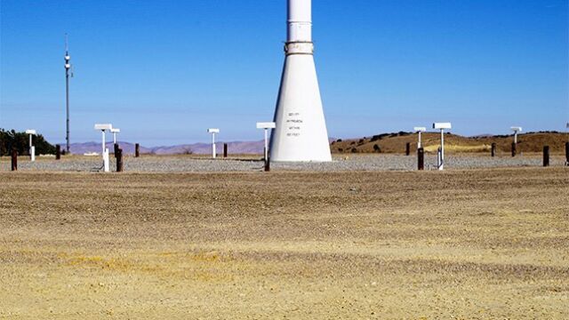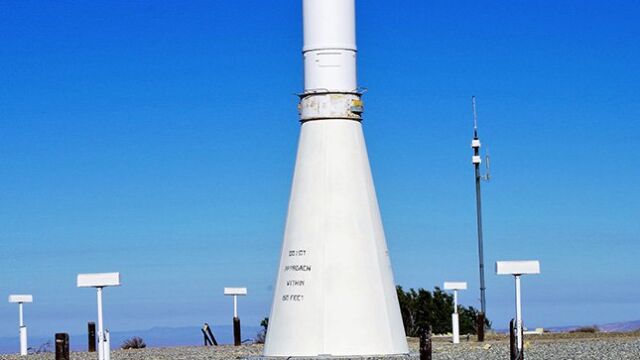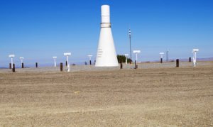 So squeezed between the shiny white 2×6 rails and walked up the driveway. The small house-sized concrete bunker hummed with AC units sticking out on all sides cooling what we assumed was massive amounts of electronics inside. Further up the road and around the bend, was a perfectly flat former hilltop, now a massive spectacularly clean gravel pad. But this was no plain, ordinary flat gravel pad that formerly was a natural hilltop; this one had a spaceship in the middle, not just the middle, in the exact center. The craft was perhaps 6 feet in diameter at the base up to about 8 feet up then tapering off to 4 feet in diameter to the top. It was maybe 25 feet tall. Around it in perfect symmetry, were maybe 20 mail box looking things surrounding the spaceship about 30 feet from the base. The boxes were about 4 feet in the air on stout posts – maybe railroad tracks like the historical markers in the Black Rock Desert and High Rock Canyon. Everything was painted white. The scene was quite striking.