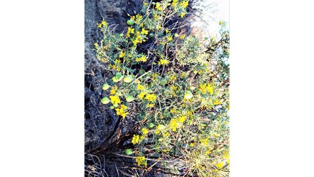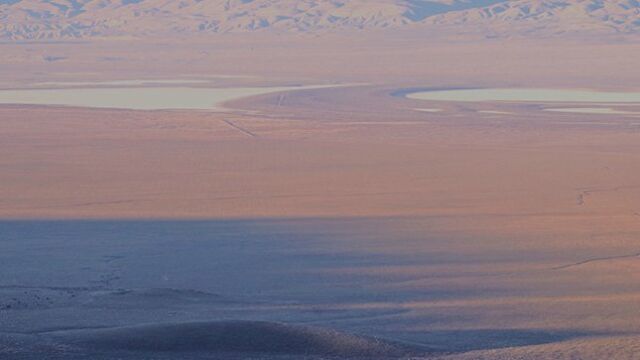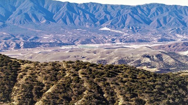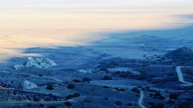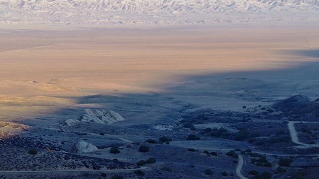 Parked at the gate, we loaded up our packs with lunch snacks and beverages. There is a trail along the hillside below us, but we decided to take the high road, as it were, and walk along the wide open ridge top. The path was perfect; wide, open, a smooth gentle rise, easy walking. We stopped often to take in the views, put the binoculars on birds, or to just soak it all in. We hunkered down in the shade about 30 feet below the road on the North slope and had a tremendous lunch with a great view out over the plains below and the Temblor Range further off in the distance. It was January 17 and we needed to find shade for lunch – unbelievable. We were just starting to think about turning around and heading back. The top of the peak was still far off in the distance so reaching it was definitely out of the realm, but the air was clear to the East and some super trippy landscapes and formations were coming into focus. We needed to continue on a bit further up the road to get a better view of this area.