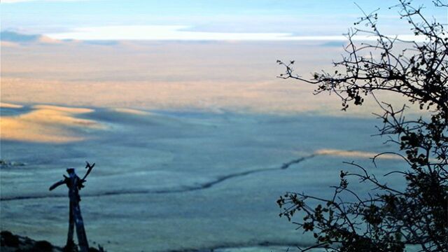 Not being a big breakfast guy, I stuck with my “fugitive on the run” morning starter of coffee, yogurt, banana, a little pumpkin pie, and more coffee. The sunrise was spectacular – not so much for the colors in the sky and clouds, but for the shadows on all the ridges, humps, bumps, rises, and ravines out on the Plain below. Soon, we were discussing the plan for this precious middle day – the best part of the two-night trip. We decided to stay local and not spend so much time in the car. This place is very much like Death Valley – massive flat uplifted valley running parallel to Death Valley, surrounded by mountains, incredible geology, erosion, immense vistas, massive skies, quiet, peaceful, solitude. The Monument is large and expansive, with much human history, wildlife, and natural features to explore and find on your own. There are numerous roads and trails and we could have exhausted ourselves and still not seen much of the place, so we decided to see what we could see near us, and enjoy that. The road we were camped on was supposed to have a trailhead a couple more miles up the hill. I assumed it stopped or was gated at that point, but as we found, it did not.