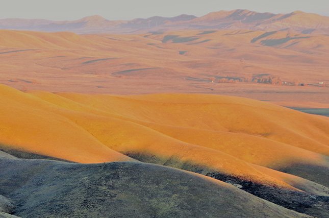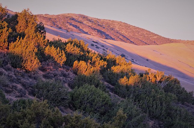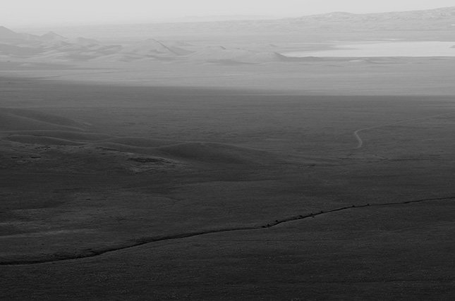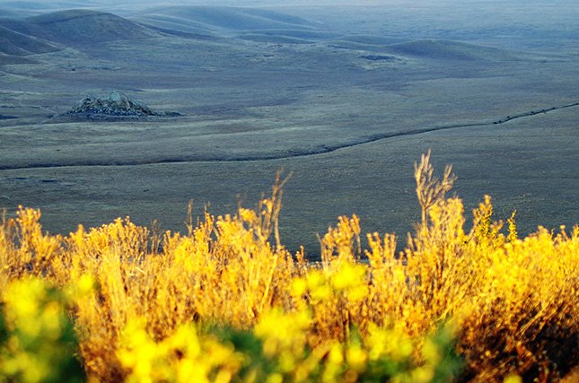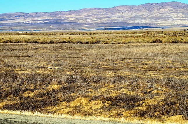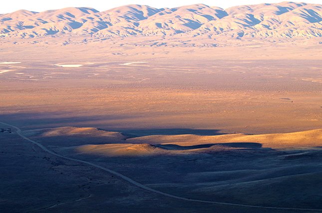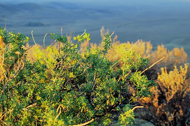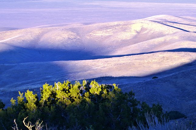 This really blew me away – I was pretty far away but it was so quiet, so peaceful, so still. An occasional breeze rustling the bushes, an occasional birdy whizzing by into some shrubbery; the call of a hawk, the call of a Raven; chirp of a little tweety bird. That was it. Silence. In gigantic open spaces like this it is so quiet. The few local sounds can be heard from great distances. Like the views and vistas and massive open landscapes that play tricks on your eyes and make judgment of distance so difficult, so too does the absolute stone cold peacefulness of the desert and open arid plains like this. I was really happy and hopefully captured some of the images of shadows, low light, and mirages that the setting sun was creating over the low lying topography below. I felt like Lawrence of Arabia – it wasn’t that desert-like; there were no sand dunes or camels, but this place felt good and the images being created, and in constant motion and permanently slightly modified into more perfectly beautiful and fluid scenes, had me. I could have made it; I could have flown with the Ravens; I could have been.