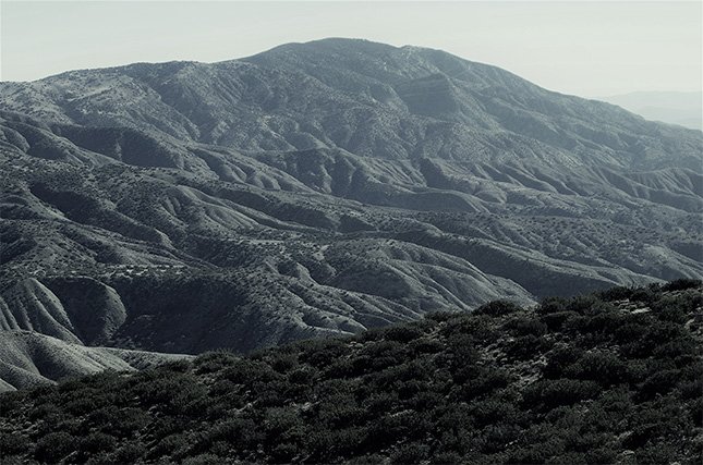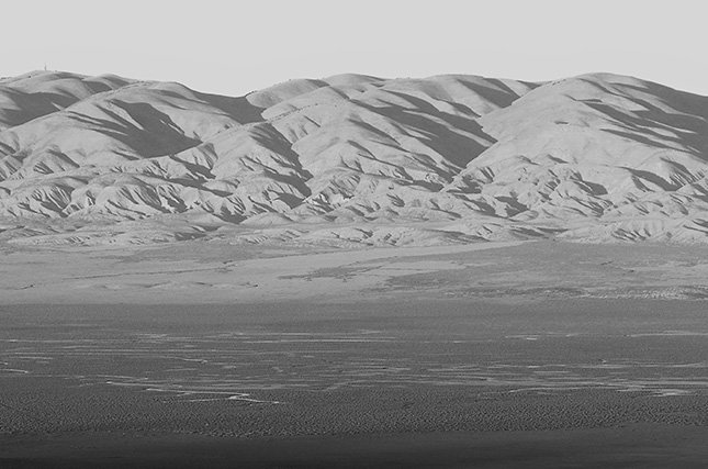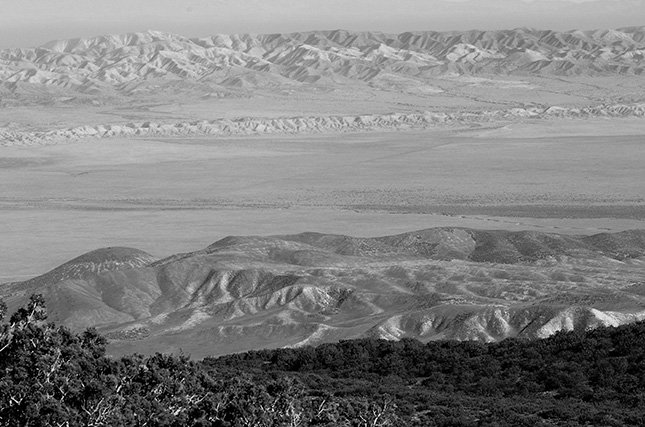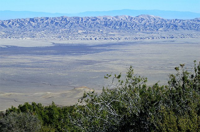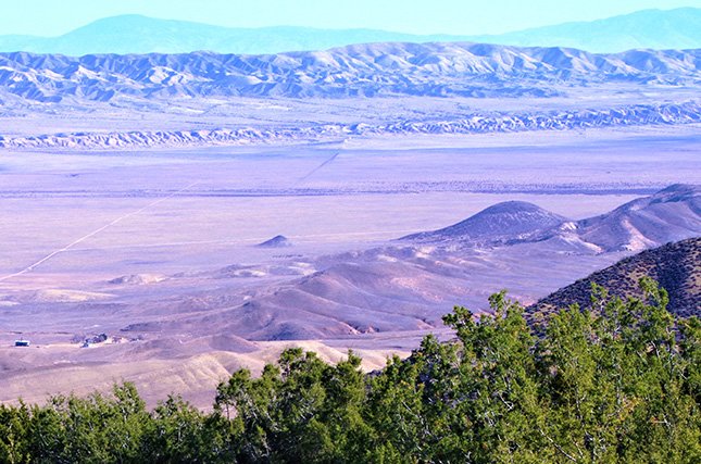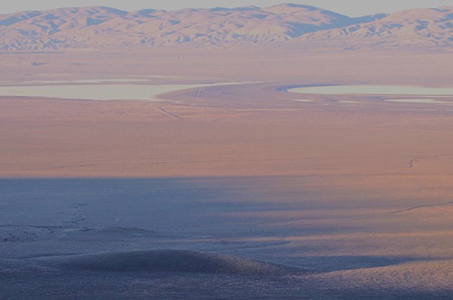 Parked at the gate, we loaded up our packs with lunch snacks and beverages. There is a trail along the hillside below us, but we decided to take the high road, as it were, and walk along the wide open ridge top. The path was perfect; wide, open, a smooth gentle rise, easy walking. We stopped often to take in the views, put the binoculars on birds, or to just soak it all in. We hunkered down in the shade about 30 feet below the road on the North slope and had a tremendous lunch with a great view out over the plains below and the Temblor Range further off in the distance. It was January 17 and we needed to find shade for lunch – unbelievable. We were just starting to think about turning around and heading back. The top of the peak was still far off in the distance so reaching it was definitely out of the realm, but the air was clear to the East and some super trippy landscapes and formations were coming into focus. We needed to continue on a bit further up the road to get a better view of this area.