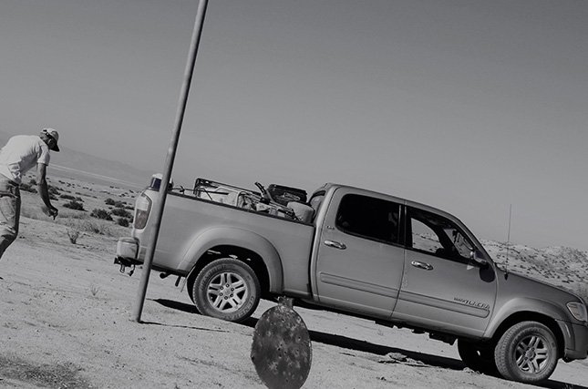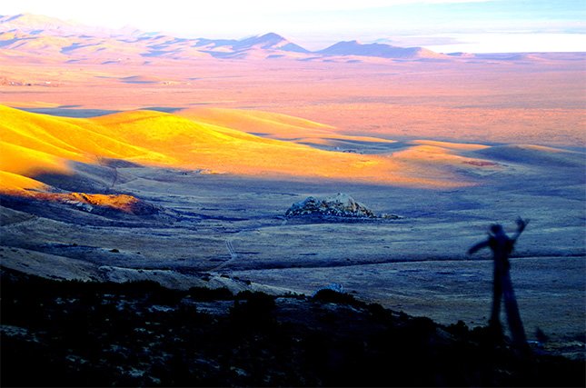 To our surprise, from up high came a light. Up and down, out of site and then within, the light became two and the orange trim lights of a vehicle became visible; a massive cloud of dust rising behind. Upon arriving at this location, I had just stopped the truck in the middle of this intersection and didn’t even think about other cars, but thank god, the roads didn’t intersect in right angles, but kinda merged in an equilateral triangle, and he came across the hypotenuse of the intersection, while we were stopped on one of the sides. Faster than his headlit approach, his tail lights disappeared almost instantly. Our frozen amazement turned to hysterical laughter. A shot of Bushmills was offered to the gods for preventing a collision of the only two vehicles in motion for 700 square miles, and the fandango blazed on.