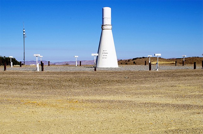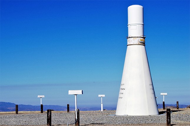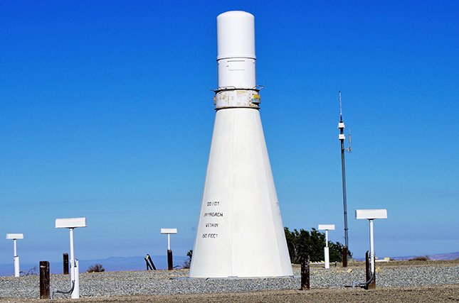 So squeezed between the shiny white 2×6 rails and walked up the driveway. The small house-sized concrete bunker hummed with AC units sticking out on all sides cooling what we assumed was massive amounts of electronics inside. Further up the road and around the bend, was a perfectly flat former hilltop, now a massive spectacularly clean gravel pad. But this was no plain, ordinary flat gravel pad that formerly was a natural hilltop; this one had a spaceship in the middle, not just the middle, in the exact center. The craft was perhaps 6 feet in diameter at the base up to about 8 feet up then tapering off to 4 feet in diameter to the top. It was maybe 25 feet tall. Around it in perfect symmetry, were maybe 20 mail box looking things surrounding the spaceship about 30 feet from the base. The boxes were about 4 feet in the air on stout posts – maybe railroad tracks like the historical markers in the Black Rock Desert and High Rock Canyon. Everything was painted white. The scene was quite striking.