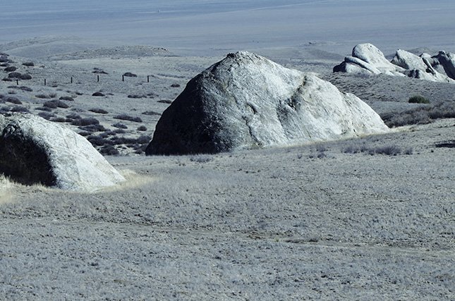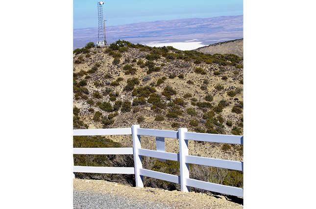 We ventured inside the ring of mailboxes and were maybe 15 feet from the spaceship when we got around to the side that had the warning about staying 150 feet away. We tiptoed away, perhaps afraid of waking the inhabitants, beyond the ring of mailboxes, but we might have had to have been off the gravel flattop altogether to get 150 feet away (maybe that was the point). So we walked the perimeter of the lot, along the glimmering white 2×6 PVC three rail fence. There was nothing higher than the fence along the perimeter on all sides, so the views were spectacular. The air was clearer this morning, I think partly because the breeze had almost completely stopped, and because towards the West, there was more moisture in the ground, more vegetation, and therefore less dust to get picked up into the air and blown about.