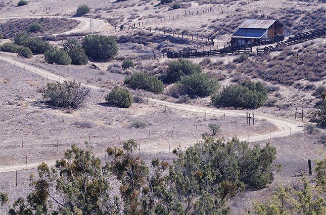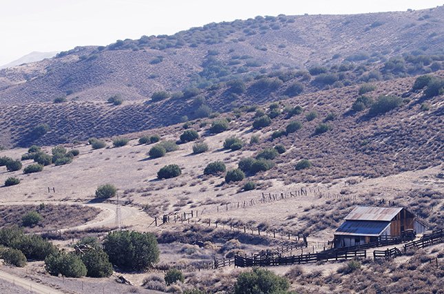 We exited I-5 onto 41, then 33, and then 46, passing near the site of James Dean fatal car crash just a few miles West of where 41 and 46 merge at Shandon. Further South we followed Bitterroot Valley Road for several miles of classic “old California” landscape – golden hills, rolling on and on, scattered clumps of Cottonwoods revealing a shallow water table; the occasional stock pond turning golden brown to cash green. A cockeyed barn, a rock wall, a wooden post, some rusty wire; just a few lasting reminders of the toil and labor of homesteaders scraping a living from this tough land.