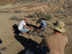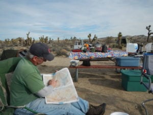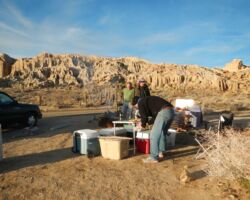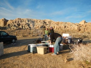 Tom and I had to work half a day so we were a few hours behind. A stop for In-N-Out burger in Stockton and to buy a grill since I forgot this item (yes, again), and we blasted down Interstate 5 as quickly as possible. We were up and over Tehachapi before sunset and almost got to the campground before darkness. Neither our message to Bob and Steve nor their message to us got through during the drive down, but as we turned into Ricardo campground and headed around the loop, the second camp site we passed had some suspicious looking characters in it. We had arrived.