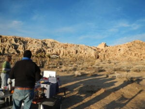 We took a loop home – a little longer but it prevented us from backtracking and we saw a few more sights along the way. We were home just in the nick of time for cocktail hour. Bob got going on his massive salmon filet and Steve warmed up some fantastic pasta. Tom was drawn to his Manhattan’s and we were quickly in full celebration mode. It was strange to be in a campground for sure – with each vehicle passing few feet from us on their trek to a camp site, but the day’s events; the spectacular sandstone wall for which the area was named; the numerous Joshua Trees scattered about; the setting sun; the fellowship and comradery of the fellas; the occasional laughter from across the campground – it all worked.