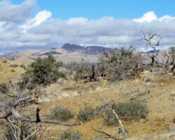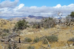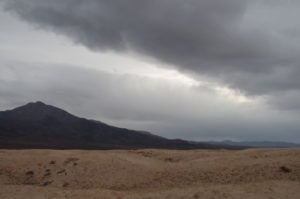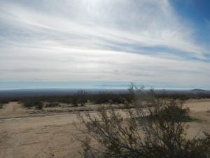 For all the “roads” breaking off this main access road, most of them were motorcycle tracks, wide enough for a vehicle, but real loose and gravelly or sandy, and often up steep hillsides. Kind of rough for the boys’ style. We were paralleling the Sierra’s again, although there was some debate whether they were the lower ridge in the foreground, or the taller one to the West. Nonetheless, it was neat to know they were out there with us, despite our heads being in the Mojave surrounded by Joshua trees.
