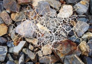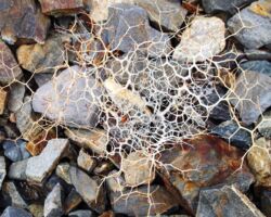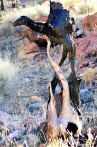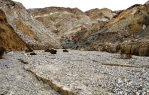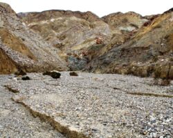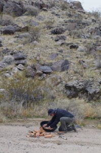 The small washes, rivulets, and depressions that the water made as it ran off the steeper slopes and onto the desert floor were fascinating. As the wash slows on the flatter ground, the depression gets shallower and broadens out and braids into a rainbow of light browns and grays. It is truly an apron effect from hillside to flattened desert floor. On the backside of the formation, someone had burnt a collection of materials and left behind a few bed or seat springs. I gathered them up and brought them back to the boys at the site, much satisfied with my off-road excursion.