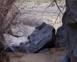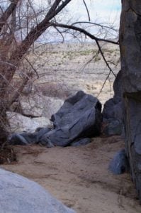 I set off on a short stroll to commune with the Joshua trees and see what there was to see. The washes were spectacular – large and small; a few inches across and a half centimeter deep to 20 feet across and 8 feet deep. They were still damp from the prior week’s rain and the dampness revealed the colors in the rock that made the gravel that made the sand. I found a few small cacti that made me happy. I saw many little birdies here and there. I scampered up a large formation, 30’ above the wash below and high enough to see into the campground. Unfortunately, it was also high enough to see Highway 14 and all the traffic that we typically could only hear from our site. I had to look away…