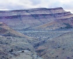 Trucky is pretty impressive every time I give it the opportunity and we crawled up quite easily and fairly smoothly. No hug pits or boulders; no crashing or thrashing. Up top was a little disappointing. There wasn’t much to it – either in size or interest. I was hoping for a cluster of trees or shrubs we could settle in behind for wind and sun protection. Or a rock formation or an old cabin foundation. But, like the vast majority of this country, it was barren rock, or gravel, or sand, depending upon the extent of the decomposing.