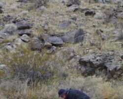 We stopped at the bottom of a very steep track ripped out of short rise that could give us pretty expansive views if we were to make it up there. Not knowing what it was like up there and the roughness of the scar we would be driving on, I decided to bow from the opportunity. We turned around and headed back to an opening the in Mesquite or Creosote Bush that had an old fire ring. We got out and roamed about. The brush was 5 or 6 feet tall and the hill that we decided not to surmount blocked out view to the West. This would not do.