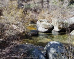 There was much talk of the creek and how cold it would be. This was, after all, still March. And even though we had 5% of our snow fall and that which did come down was very dry as compared to the water content of “normal” years, we were still at 5800’ and this water was still largely coming from snow melt. I believe Tom was the first in. Mike dipped a toe and ran off screaming into the woods. Ken, known for dunking no matter the conditions, took a quick sit and was out. Bob got in a little deeper, Mike reappeared far more determined. Ken re-entered.