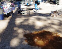 He was real cool. We weren’t supposed to be parked down here – too far off a real road and too close to the creek. He just asked us to move the rigs and split. I don’t even know if he stayed close enough to make sure we moved, but we did right away. I am sure between our age and the fact that we all had vegetables in our hands when we were talking, calmed his itchy trigger finger and allowed the interaction to precede blood free. We did have 3 fires going and it was obviously a large group (and soon to grow), but he left unconcerned, even though Bob’s rig sat where it was; having to wait for his return.