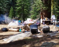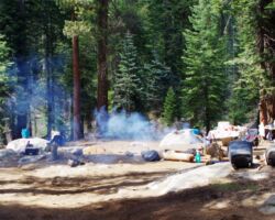 A few miles further up Silver Fork Road, I turned right on Forest Road 9N10, a dry dirt road that dropped to the creek, crossed it, then rose again. I saw movement off in the bushes and slowed enough to see Steve coming to greet me. The sharp right turn was manageable, but it dropped away steeply so that I could not see the direction or the condition of this road at all. I stopped on the precipice, got the go-ahead from Steve and dropped over the edge. The road quickly dropped into a wide open, relatively flat spot, with plenty of room for rigs, tents, tables, etc. It was a real nice spot. I was greeted by the boys who were busy gathering wood, setting up tents, generally preparing camp. It was great to be there.