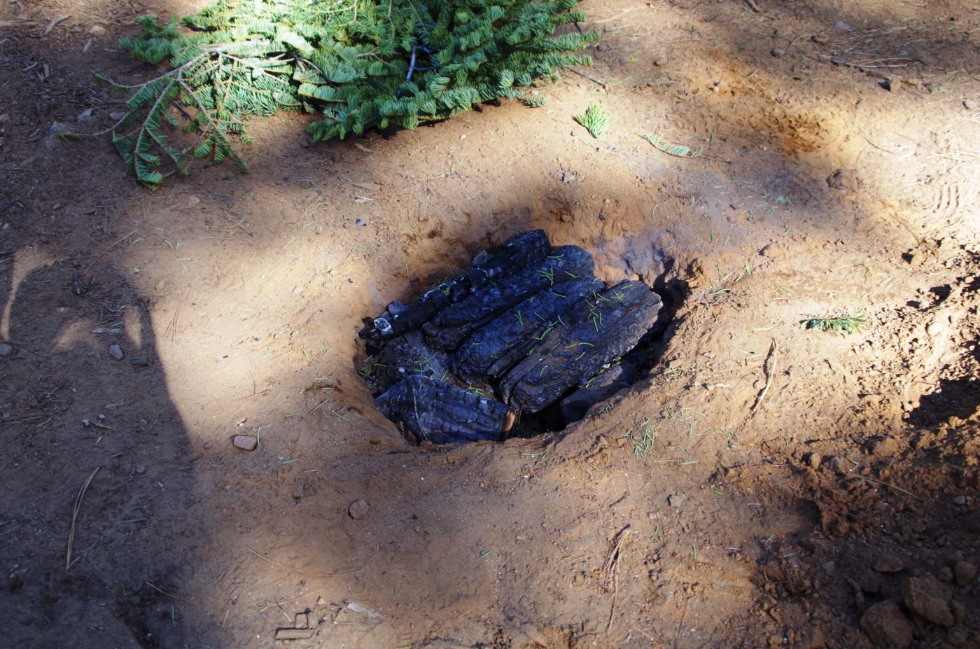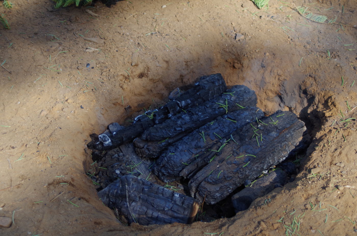 At 4:00, it was decided to just go for it. The coals were black, not glowing red, but it was almost all oak, and it was late. We wouldn’t eat until 7:00 at the earliest, so we needed to leap and hope for the best. Steve had dug a great hole; maybe 2 feet deep and 18 inches wide in good red clay soil. We dropped a nice bed of our best coals in the bottom and dropped the 14 quart oven on them, then we stacked the 12 quart on top of it, and poured the rest of the coals in. We needed to place a few blackened logs on top of the hole, not only to fill it up so the dirt wasn’t all around the lid (I also forgot the lid puller off tool gizmo), but also to cram all the heat we could into that hole. For no practical reason, Bob put some Fir branches on top of the hole and we covered it with dirt. The confidence level was not high, but it was going to do what it was going to do. The boys were together at a fantastic spot along the creek, and it was all good.