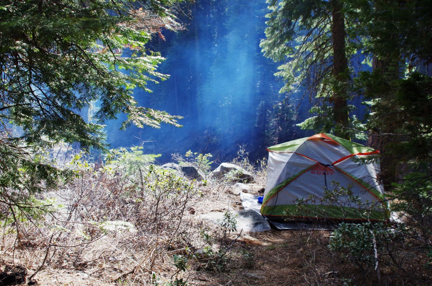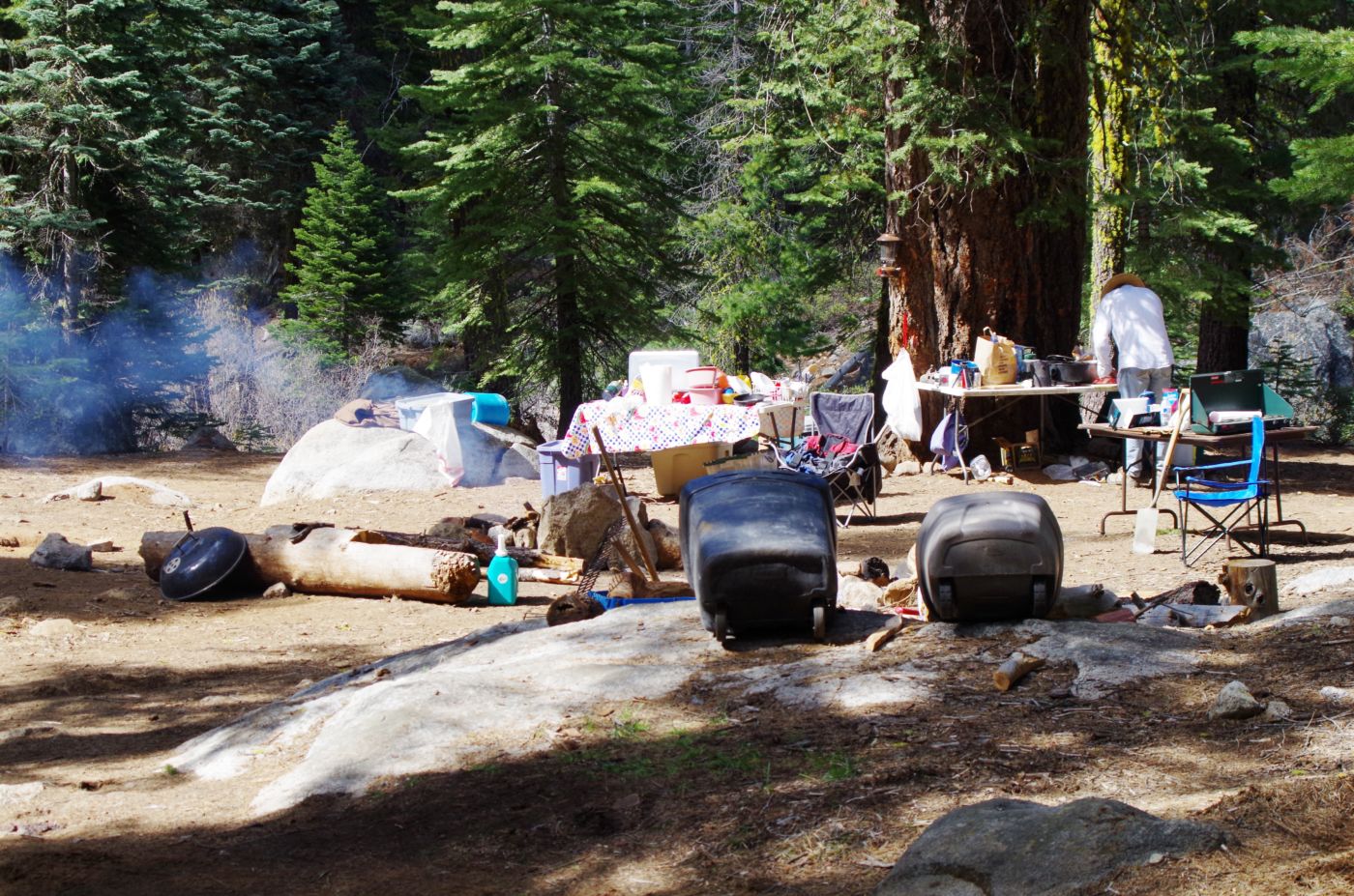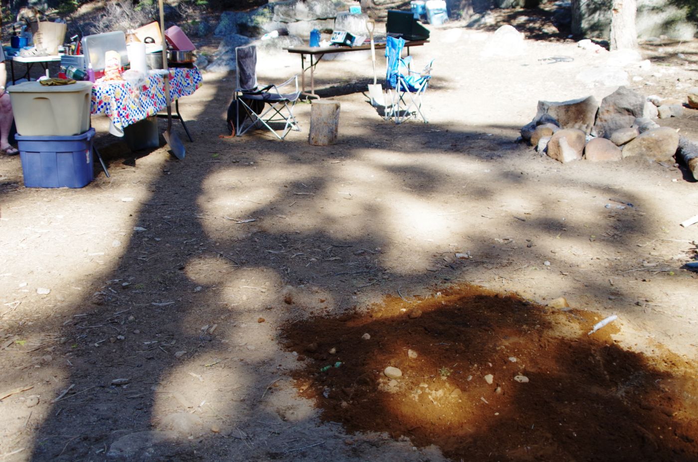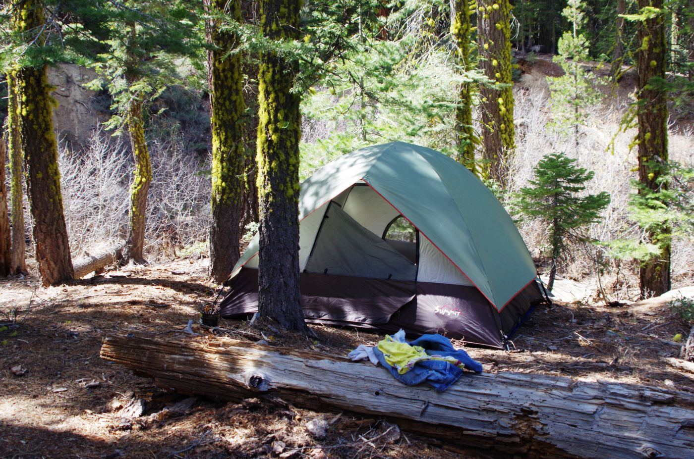 A few miles further up Silver Fork Road, I turned right on Forest Road 9N10, a dry dirt road that dropped to the creek, crossed it, then rose again. I saw movement off in the bushes and slowed enough to see Steve coming to greet me. The sharp right turn was manageable, but it dropped away steeply so that I could not see the direction or the condition of this road at all. I stopped on the precipice, got the go-ahead from Steve and dropped over the edge. The road quickly dropped into a wide open, relatively flat spot, with plenty of room for rigs, tents, tables, etc. It was a real nice spot. I was greeted by the boys who were busy gathering wood, setting up tents, generally preparing camp. It was great to be there.