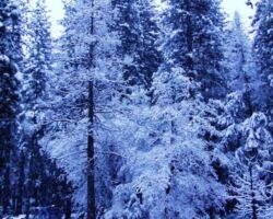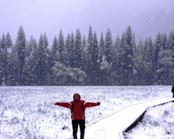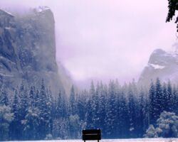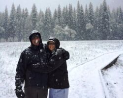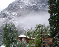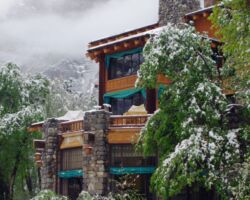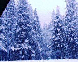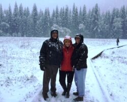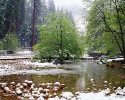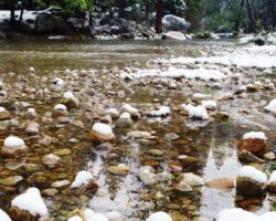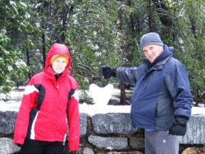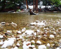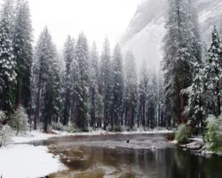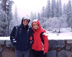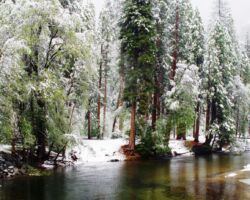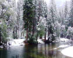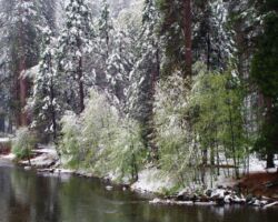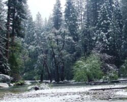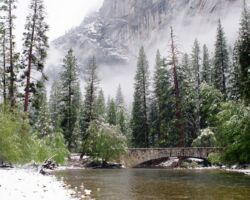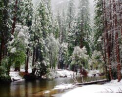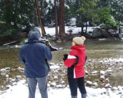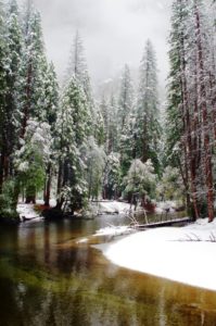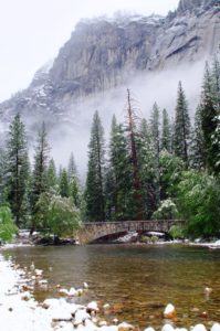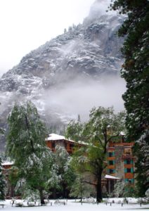 We were headed off to Curry Village for a coffee and a hot chocolate or 2, if Curry Village hadn’t been eliminated in the avalanche we heard. The few people that were up and around Curry this early in the morning were all abuzz at the snow and the scenery and the spectacle. In a few minutes they began serving breakfast so we went through the cafeteria style food court piling up French toast, pancakes, bacon, and ham. It was great fun to get a warm breakfast on a snowy morning. Full, warm, and raring to go, we needed to get back out in the snow and decided to head to the Ahwahnee. That was a magical walk – across the meadow, into the woods, along the river, over the bridge. Each area was so beautiful, covered in snow; we just tried to take it all in and fill up on this experience.