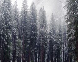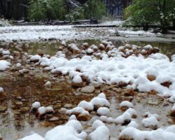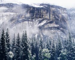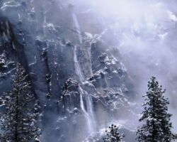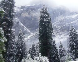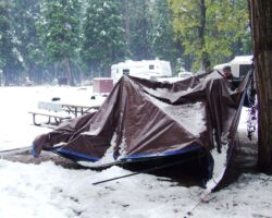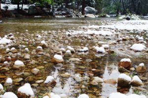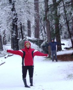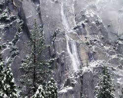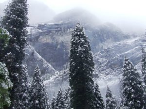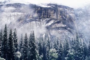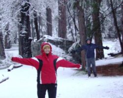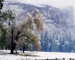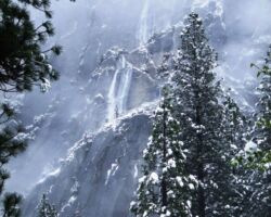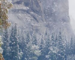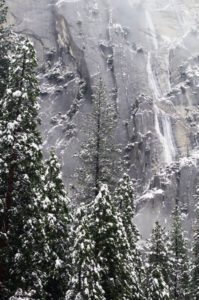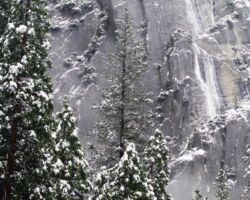 We went back to the camp sight and got socks and pants and hats and gloves and scarves and prepared to head out again. As we were mustering in the opening outside our tents, we heard the rumbling of snow and rock tumbling down the Glacier Point wall. It was eerie and would definitely have been scary if we weren’t so taken by the falling snow and the wonderful winter scene. This was, after all, the exact location of the massive rock slide in 1996 that thrashed Happy Isles and this campground and killed a camper – in her campsite. What we heard also must have been a massive amount of material crashing down an unknown distance off the wall, an unknown distance away. Fortunately for us, it was just another wondrous event that added to the spectacle and awe of this incredible morning.