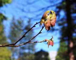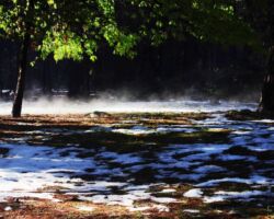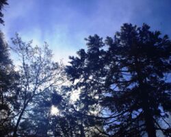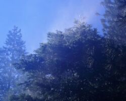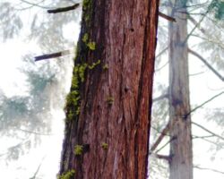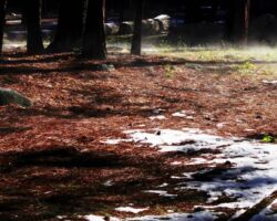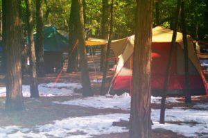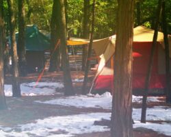 Admitting to the defeat of the failed Gin Fizz attempt, and being sufficiently rested and warmed (dry would have to wait some time), we began our journey back to the campground. The snow had ceased falling for the time being, but the warming air and intermittent sun was provoking clumps of snow to crash out of the trees. This made for great fun walking through the woods. We couldn’t help but shrug up our shoulders and pull our heads inside, doing the best turtle impression we could whenever we heard the sweep of the snow pass through the tree leaves and branches as it broke away, bracing for the inevitable thump as the load spanked the ground. No one was hit, directly anyway, but we laughed and laughed as they fell near , sprayed us with mist as they broke apart overhead, or splashed up from the growing pools and puddles of snowmelt.