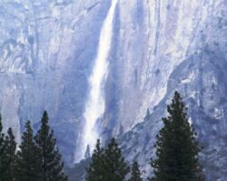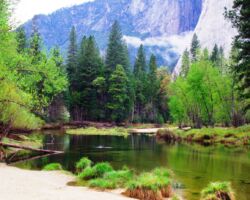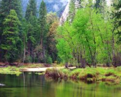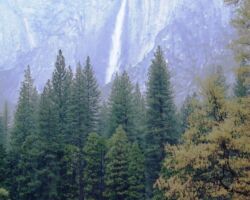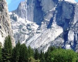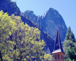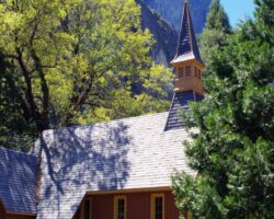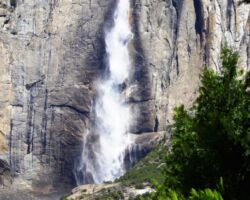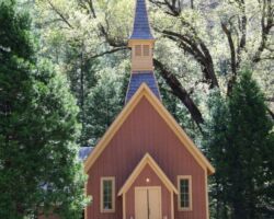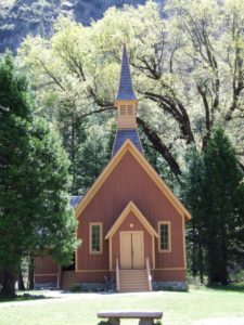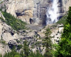 After saying goodbyes to Mike and Sharon, we used several ready-made excuses not to leave quite yet. K had wanted to see the chapel, so we made a left turn on the way out to return to the valley floor and stopped on the way in to visit the chapel and take a few pictures. The chapel just happens to be directly opposite Yosemite Falls, across a beautiful meadow and the oaks and Cottonwoods growing along the river’s edge that meanders across it. The falls were a little beefed up from the rain and the melting snow from the higher elevations as a result of the weather we had earlier in the week. All you could see of the snow now was slight dustings at the very tops or protected north-facing crevices; but all of the precipitation was now feeding the falls and they were magnificent.