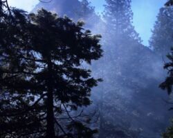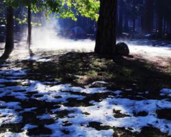 It rained pretty good again that night. The morning was gray and overcast, but no rain. We had a good breakfast and lots of coffee around the fire. It began to drizzle off and on so we were not sure what to do. We decided to waddle over to Curry for showers. We hung inside after and looked at the massive photos of Curry of yesteryear. There were several images of the Firefalls and photos of the guy that yelled up to Glacier Point, “Let the fire fall”. My mom said that the first neighbor she had at Nazareth House when she first moved in used to be that guy. He also played the piano and sang. I figured these photos were not of him, but probably the original Mr. Curry. Mom’s neighbor might have been one of the last guys to do it. I believe the last Firefall was in 1968. I was lucky enough to see it as a little kid, but I still don’t know why they yell out “Elmer” before and after the Falls and randomly at night – must have been a gag years ago that a few of the old timers carried on.