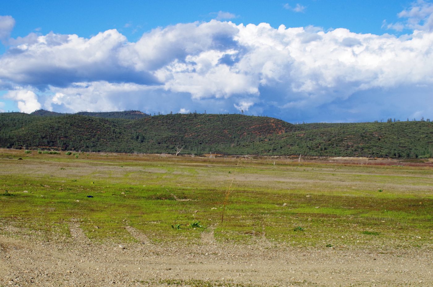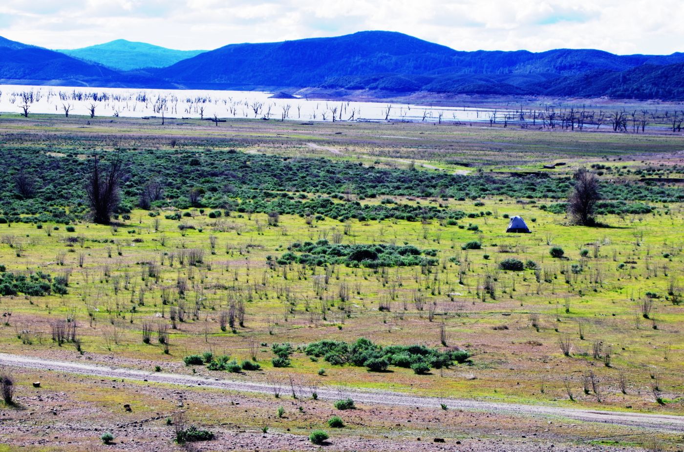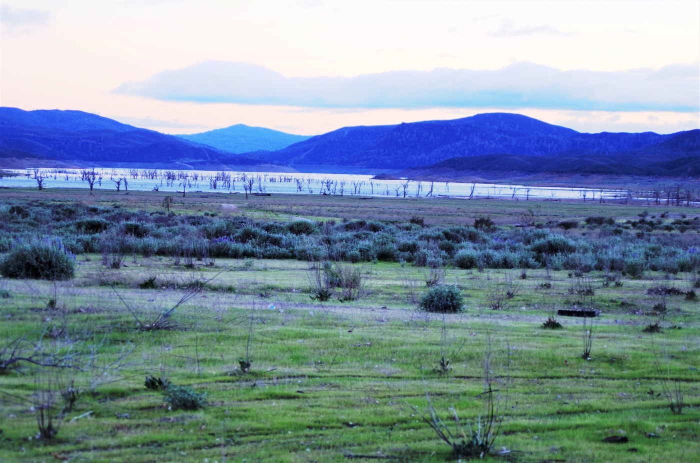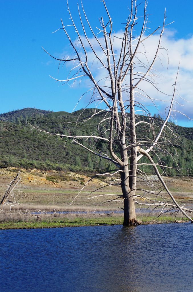 We walked out around a point and finally, on the far side of the reservoir, we could see the lowest point, covered by some amount of muddy waters, pierced by dozens of trees, bleached white; a haunting contrast to the greyish brown water, the red mud ring exposed by the receded water, and the green brush above the line formerly marked by water. Beyond the last pools of water, the grassy plains now looked more natural than what would have been a huge bathtub of agricultural irrigation. One could easily see this scar returning to a more natural state if allowed or provided the chance with continued drought.