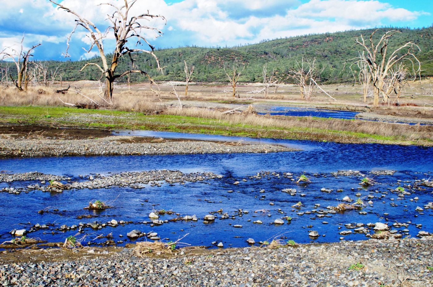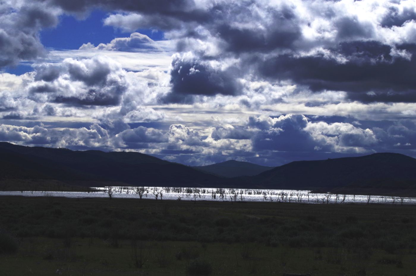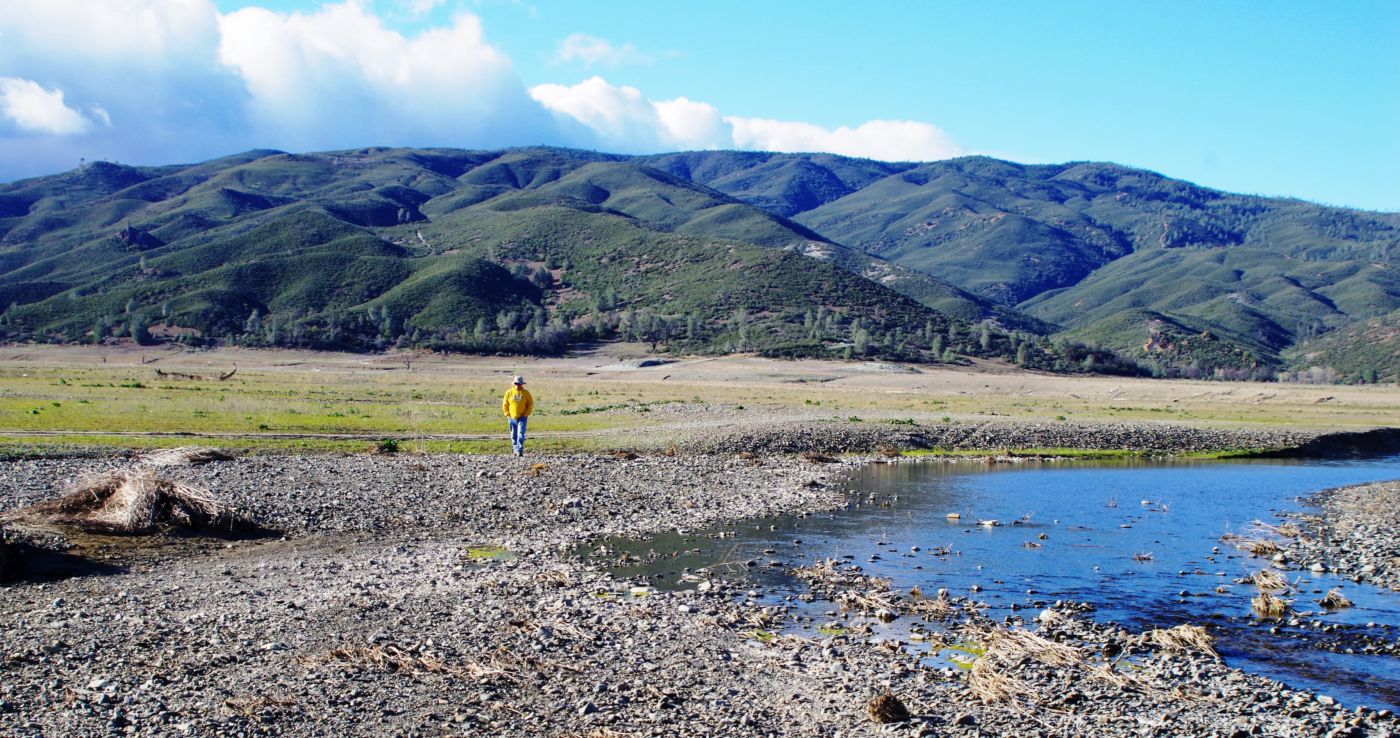 We walked out around a point and finally, on the far side of the reservoir, we could see the lowest point, covered by some amount of muddy waters, pierced by dozens of trees, bleached white; a haunting contrast to the greyish brown water, the red mud ring exposed by the receded water, and the green brush above the line formerly marked by water. Beyond the last pools of water, the grassy plains now looked more natural than what would have been a huge bathtub of agricultural irrigation. One could easily see this scar returning to a more natural state if allowed or provided the chance with continued drought.