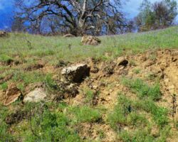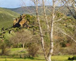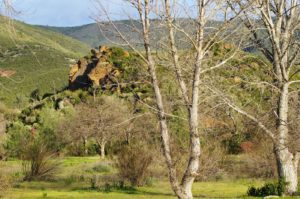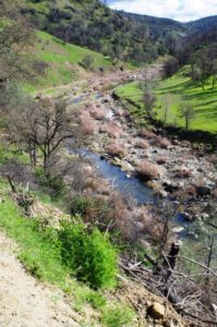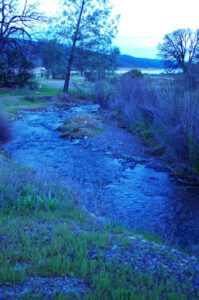We drove out to the spot Mike and I camped, and then out to the water’s edge but it was completely open out there; no shrubs, or trees, not even old snags long drowned by the reservoir. They are king of creepy on one hand, but very cool and impressive also. Especially with the potential for pending weather, I wanted some ability to rig a tarp for wind and/or rain shelter. So, we got back on Bartlett Spring Rd. and headed further West down the road to check out the NorthWestern arm of the reservoir that was now more like a natural creek winding its way through the riparian plain and eventually flowing into the reservoir.