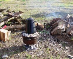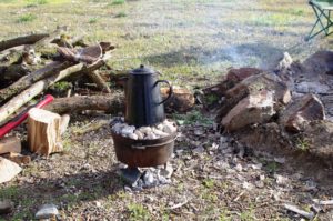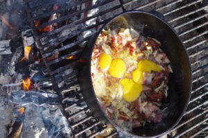 I was up early to a glorious morning. The clouds were definitely threatening, but no wind and not cold at all. I had a great little fire, made coffee, and baked the biscuits in the Dutch oven. Jordan made perhaps the best breakfast I have ever had. He cut up a ton of pepper bacon in the cast iron, dumped it out, then put in some shredded potatoes and then scrambled eggs and then added the bacon back in – my god was it good. I could have crawled back to bed, but Jordan was raring to go.