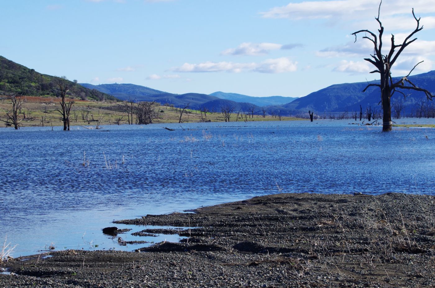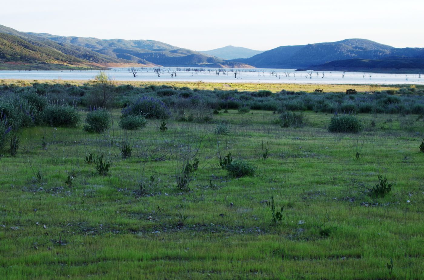 We drove out to the spot Mike and I camped, and then out to the water’s edge but it was completely open out there; no shrubs, or trees, not even old snags long drowned by the reservoir. They are king of creepy on one hand, but very cool and impressive also. Especially with the potential for pending weather, I wanted some ability to rig a tarp for wind and/or rain shelter. So, we got back on Bartlett Spring Rd. and headed further West down the road to check out the NorthWestern arm of the reservoir that was now more like a natural creek winding its way through the riparian plain and eventually flowing into the reservoir.