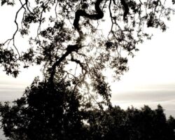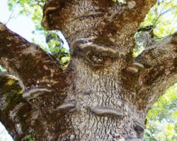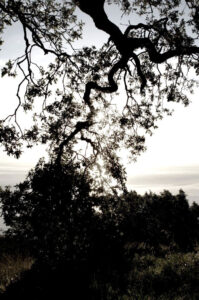There was a very cool oak tree up top with only half of its trunk, and that was only a couple inches thick; the entire middle was gone. On top of that, the one third of the circumference that remained, had a 1 foot diameter hole in it, but the thing still had a pretty healthy, large, somewhat balanced crown. It was a super trippy tree. But the one I really wanted to photograph, I almost missed again. I remembered it from our last trip – it was like a cartoon or a magic garden type of tree. Not only was it massive, but it had all of these weird and mysterious growths – very strange shapes, textures, and lumps, even for an ancient White Oak on an exposed ridge, 3,000 directly above the Pacific.