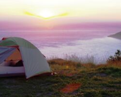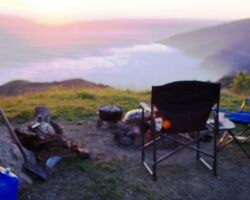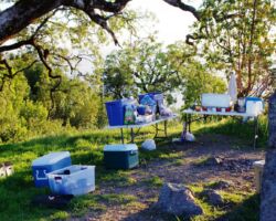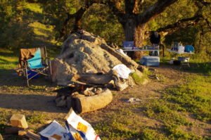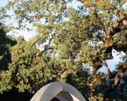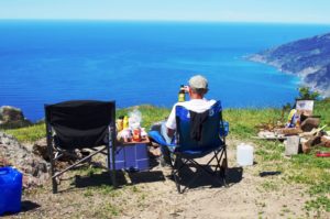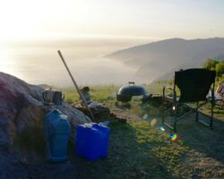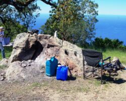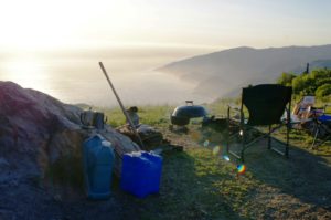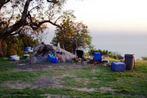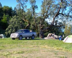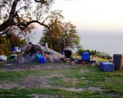 We maneuvered the rig over to the grinding rock and unloaded and hunted for the most level spots to put our tents. I ended up near the ravine under the oak tree set back from the edge a little with a mottled ocean view through the massive branches of the oak tree. Steve went for full view perched out in the open on the edge of the precipice. We were unloaded and pulling the truck out away from the camp so we didn’t feel it so much, when a rig came down the road and slowed to check out our spot. I was glad I was in the rig moving it as it may have given the impression we were occupying more of the total area than we were, as 70 % of the clearing was vacant – not being near the edge with the view but below the rise from the high point in the middle to the road.