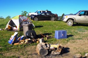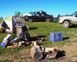 Not even close. As we were talking with Ryan and Nicole up by their car, 4 cars came slamming into our spot again, within feet of the rigs, feet of Steve’s tent and feet of all of us, now standing in a group. This time, we didn’t even let them get out of the cars. Ryan and I approached the closest car and let them know they couldn’t stay here. We just had this conversation with another big group and it wasn’t going to happen. These guys were a little less willing to pack it in, I guess in light of their being an even bigger group and it getting later in the day to look for other spots. They gave us the low on gas bit, the only one tent (unlike the only one bag) story, the “we’ll be good” – you won’t even know we are there; it’s crowded up there, etc., etc. Reluctantly, they packed up and split. Steve got my keys and moved the truck to all but block the access to the clearing. It was clear we needed to guard our spot.