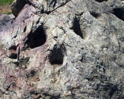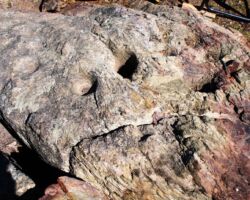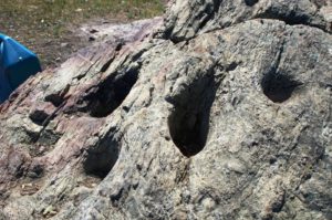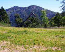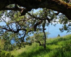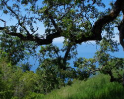 The clearing was circular, occupying a large portion of the inner loop of the road. On the left/South side was a shallow depression that could be seen despite the tall grass. It could carry water in the wet season, but now just looked like a grassy nook. At the end of the nook, just before the hill gave away sharply, was a massive White Oak spreading its massive arms perfectly, with many smaller limbs in a very vertical habit. Most of these then came within feet of the ground and turn upwards, giving the impression of a Chicago horn section. A few feet from the tree, higher up on the flat ground was a large rock, 6 feet around and 4 feet tall. It had 5, 6, 7 grinding holes of various depths but all about the same diameter. The rest of the area, roughly 100’ in diameter was short grass, as if it had been mowed. It was much shorter than the natural grass in the low spot and mush shorter than the grasses on the hillside that dropped off to the West. Just about smack dab in the middle of the entire area, was a rounded knob of bare gravel where no grass grew. This was the high point and about the center point of the opening and although there were very few truly level spots, it was incredible to find such a large open area vacant, not up against the road, with some shade, with the grinding rock, and with the best view of the ocean you could imagine.