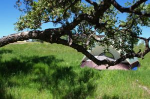 Unfortunately, all signs seemed to be indicating a longer stay rather than a briefer one. One of the girls got out her yoga mat and began an extensive session not 4 feet from Steve’s tent. The other girl pitched herself over the edge of the hill and sprawled out in the sun amidst the lupine, poppies, buttercup, milkweed, and poison oak. One of the guys was gathering sticks. While, as a middle aged American male, I had fantasized about a group of sorority girls joining us on a camp trip, somehow this particular reality was too much for me to bear.