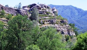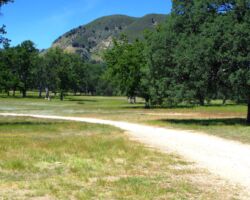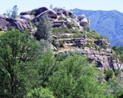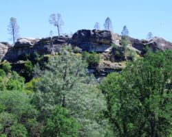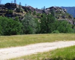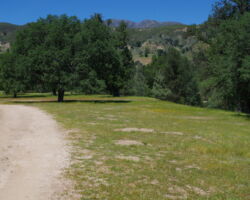 We drove a short loop road that comes along the back side of the rock and along Santa Lucia Creek. It is not a campground having no water, table, rings, etc., but it does get used as such and for good reason. There are numerous large oaks spread over large flat open grassy meadows. There are cows to be sure, but they may be kept on the North side of the road. There are a few other short roads or spurs that head down to the creek for other dispersed camping spots near the creek in the 5 mile stretch or so of road between the NF-HL boundary and the Santa Lucia Memorial Park that enjoys a fantastic setting at the head of the valley and the confluence of several creeks draining the higher elevations of the Santa Lucia Mountains and the Ventana Wilderness. We drove loop Road #4 and stopped at a site above the creek in the shade of the oak to have a little snack and a refreshing beverage. It was a great spot with creek and rock views and no one else in sight. There were perhaps only 3 or 4 other camps set up in the entire area. There were maybe a dozen cars parked at the trailhead by the rock formation, but all the people must have been out on the trail or down at he crick. It is definitely worth a return visit for a prolonged stay.